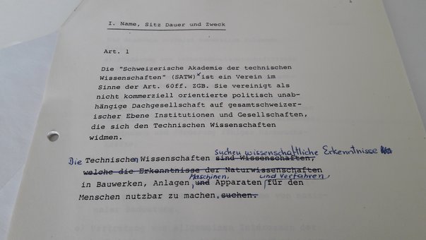 Als wichtiger Teil der Vorbereitung mussten die Statuten der SATW ausgearbeitet werden. In Artikel 1 wird unter anderem der Zweck der SATW beschrieben.