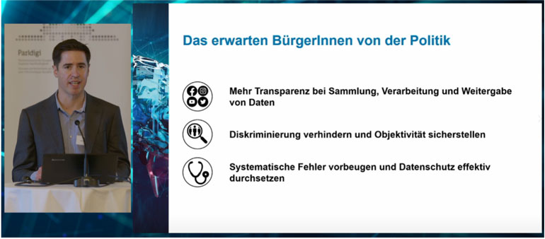 Matthias Stürmer, Geschäftsleiter von Parldigi sowie Leiter der Forschungsstelle Digitale Nachhaltigkeit der Universität Bern, führte als Moderator durch die Veranstaltung. Den thematischen Auftakt machte Anna Jobin vom Alexander von Humboldt Institut mit ihrer Keynote zu KI und Ethik. Sie zeigte auf, dass KI-Systeme auf statistischen Berechnungen basieren, die schlussendlich blosse Wahrscheinlichkeitsangaben liefern. Es gilt daher zu beachten, dass bei Rückschlüssen auf deren Ergebnisse – unabhängig von der Menge an zugrundeliegenden Daten – Korrelation nach wie vor nicht mit Kausalität gleichgesetzt werden darf. Moralisch besonders problematisch ist das beim «digitalen Profiling», wenn Rückschlüsse auf das Verhalten von einzelnen Menschen und damit verbundenen Entscheidungen getroffen werden, obwohl kein direkter Bezug zur betreffenden Person vorhanden ist.