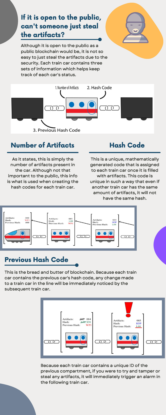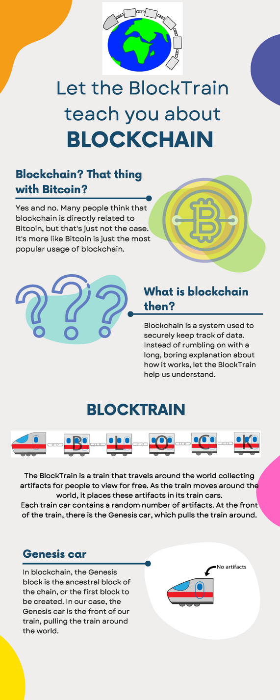 Dabei entstand eine Infografik zum «Blocktrain». Diese Grafik zieht eine Analogie von Güterzug und Blockchain und erklärt anhand eines Zuges, wie eine Blockchain funktioniert.